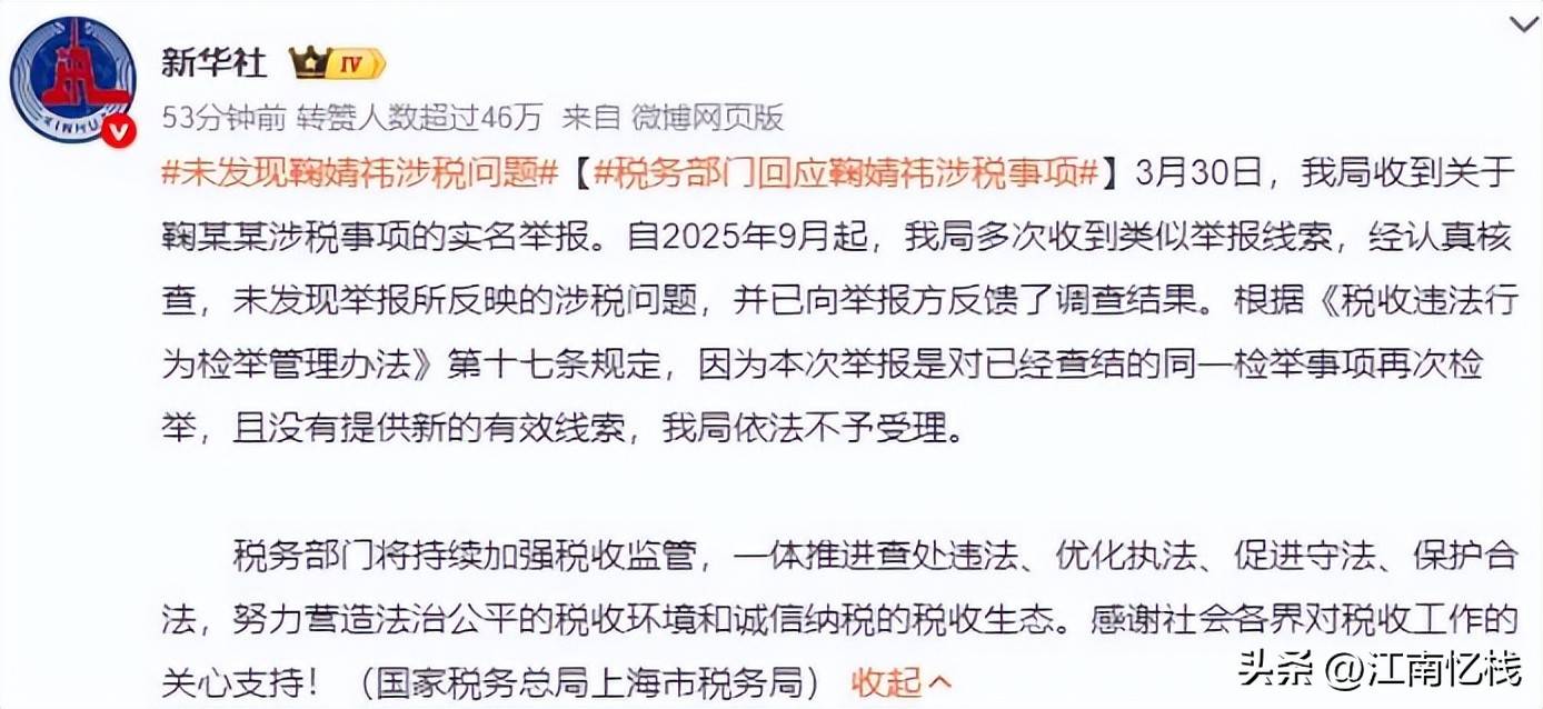 3月31日,上海税务部分宣布处境宣布,自2025年9月起,已众次收到相像举报线索,经不苛核查,未创造举报所响应的涉税题目,已向举报方反应了侦察结果。