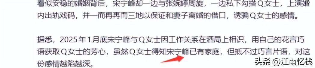 据网友爆料,宋宁峰于2025年1月与Q密斯正在酒局了解后繁荣婚外情,其间众次允许分手但未兑现。